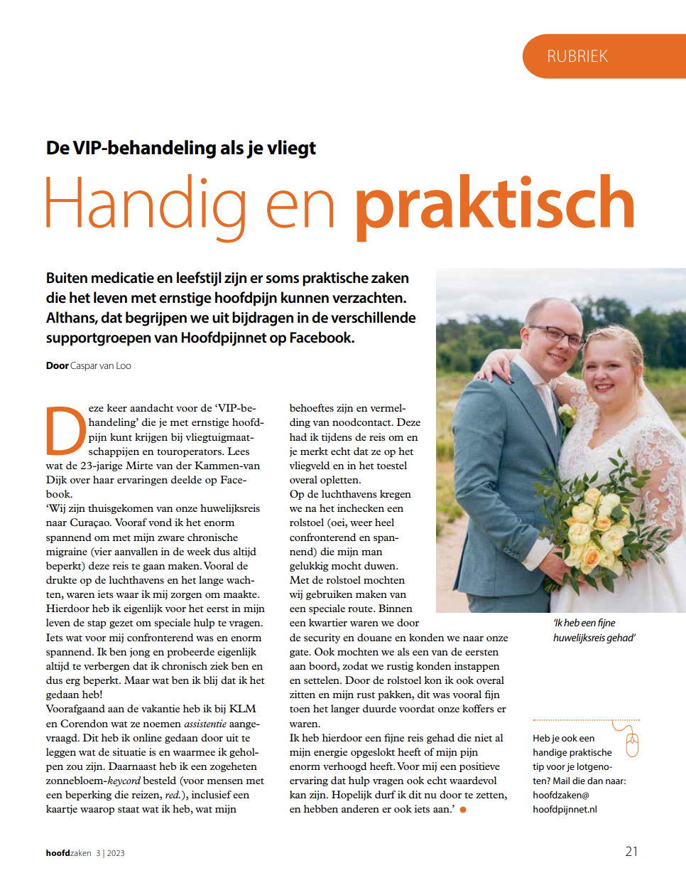 In 2023 was ik te zien in bovenstaand artikel. Dit is een artikel uit het blad Hoofdzaken, wat gemaakt wordt door Hoofdpijnnet. Op het moment van het schrijven van dit artikel was ik nog niet begonnen met Migraine Crafts maar voelde ik wel al de passie om te delen en andere te helpen. Ik ben trots dat ik hier aan mee heb mogen werken!